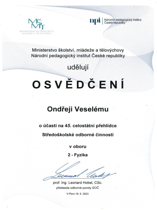 Ve dnech 16. 6. - 18. 6. 2023 proběhl v Plzni 45. ročník celostátní přehlídky prací SOČ. Náš žák Ondřej Veselý ze třídy MC3A obsadil velmi pěkné 7. místo v sekci 02 - Fyzika.