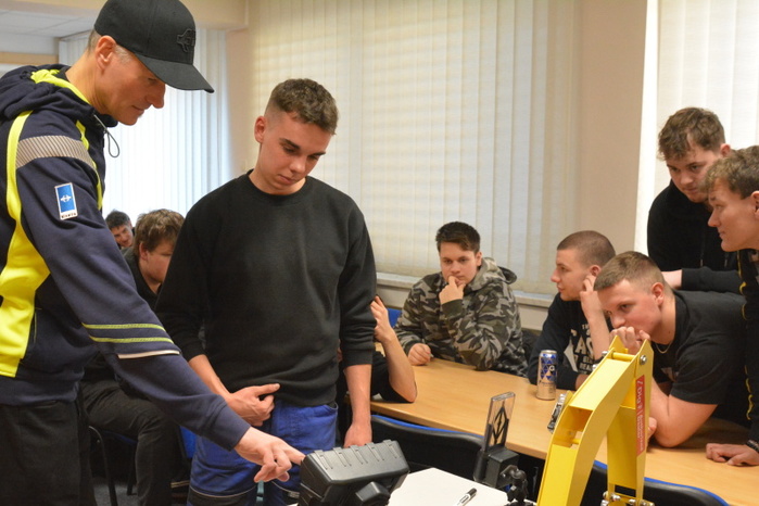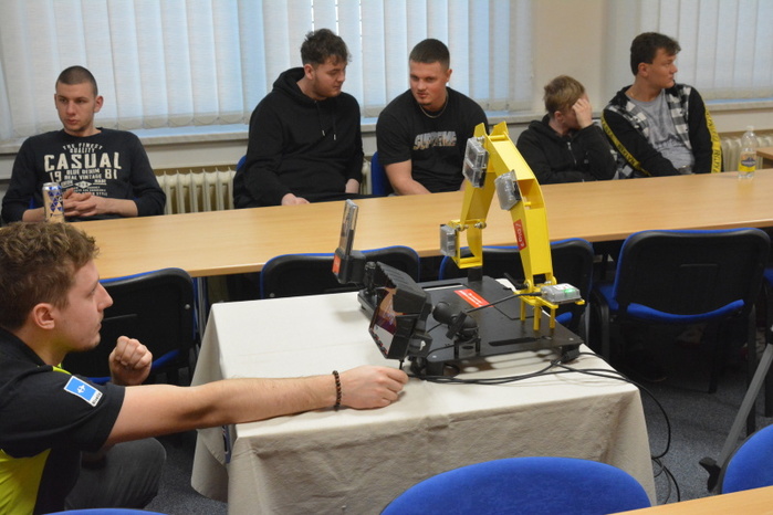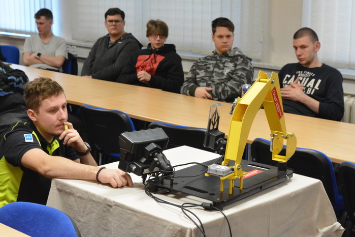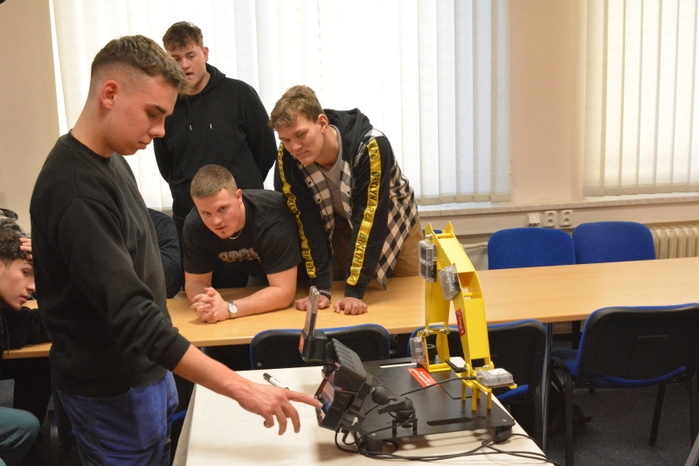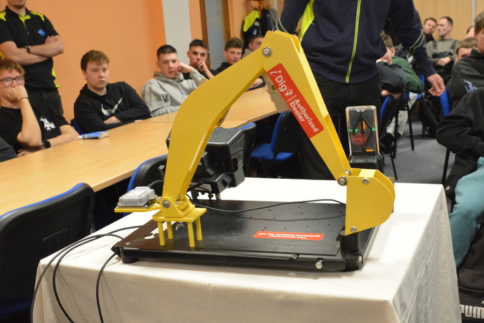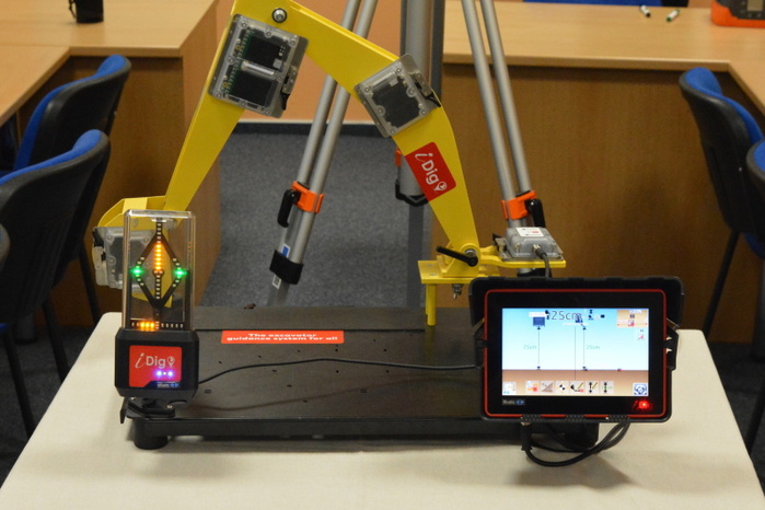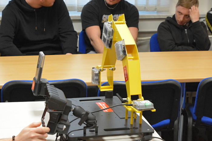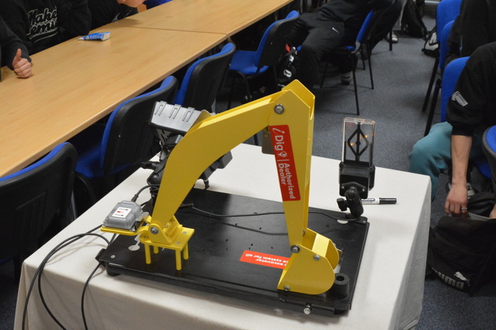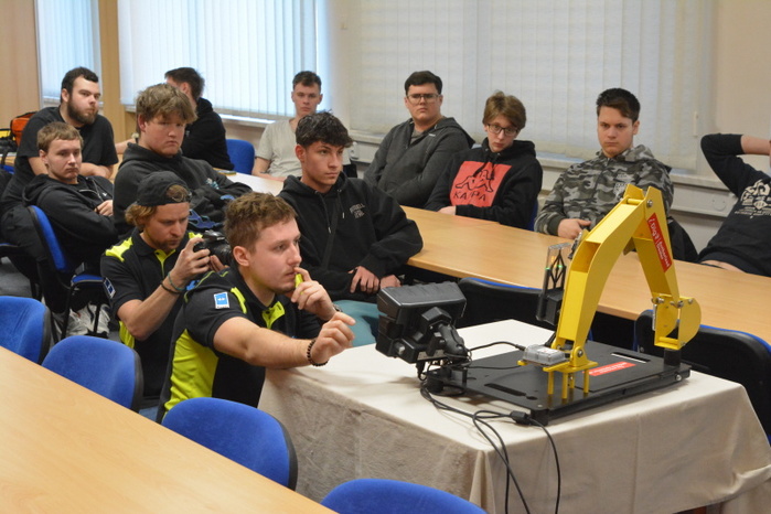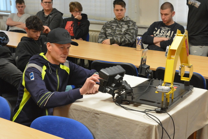 Součástí přednášky byla i praktická ukázka činnosti řídícího systému intuitivní nivelace ramena rypadla. Uživatelsky poměrně jednoduché nastavovaní nivelace lžíce rypadla si mohli na modelu zařízení, za instruktáže přednášejícího, Ing. Ondřeje Hájka, vyzkoušet i žáci naší školy.