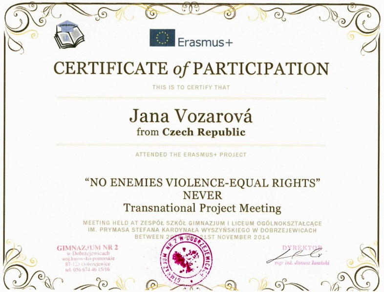 Každý účastník setkání obdržel Certifikát o účasti; níže je na ukázku jeden Certifikát zobrazen.